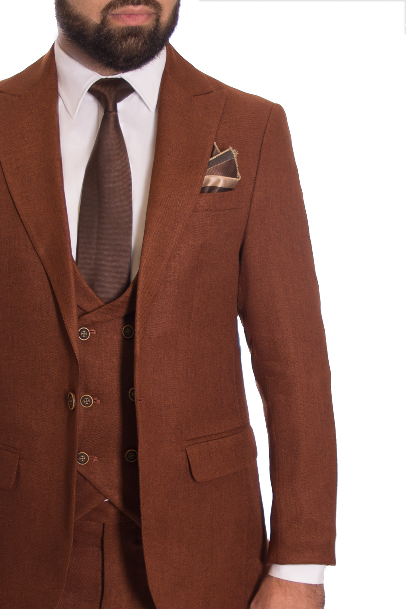 Costumul Coniac este format din 3 piese: sacou, vestă și pantalon. El reprezintă un articol statement din garderoba ta, deoarece poate fi o alegere înțeleaptă pentru un cocktail party sau un eveniment ce are loc pe timp de seară.