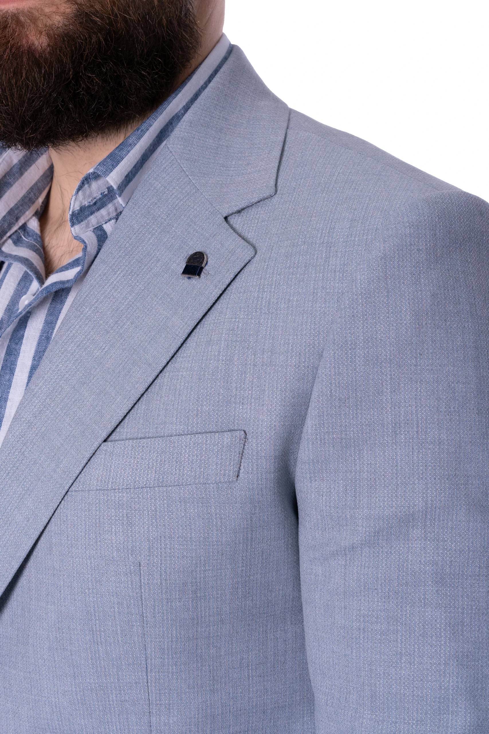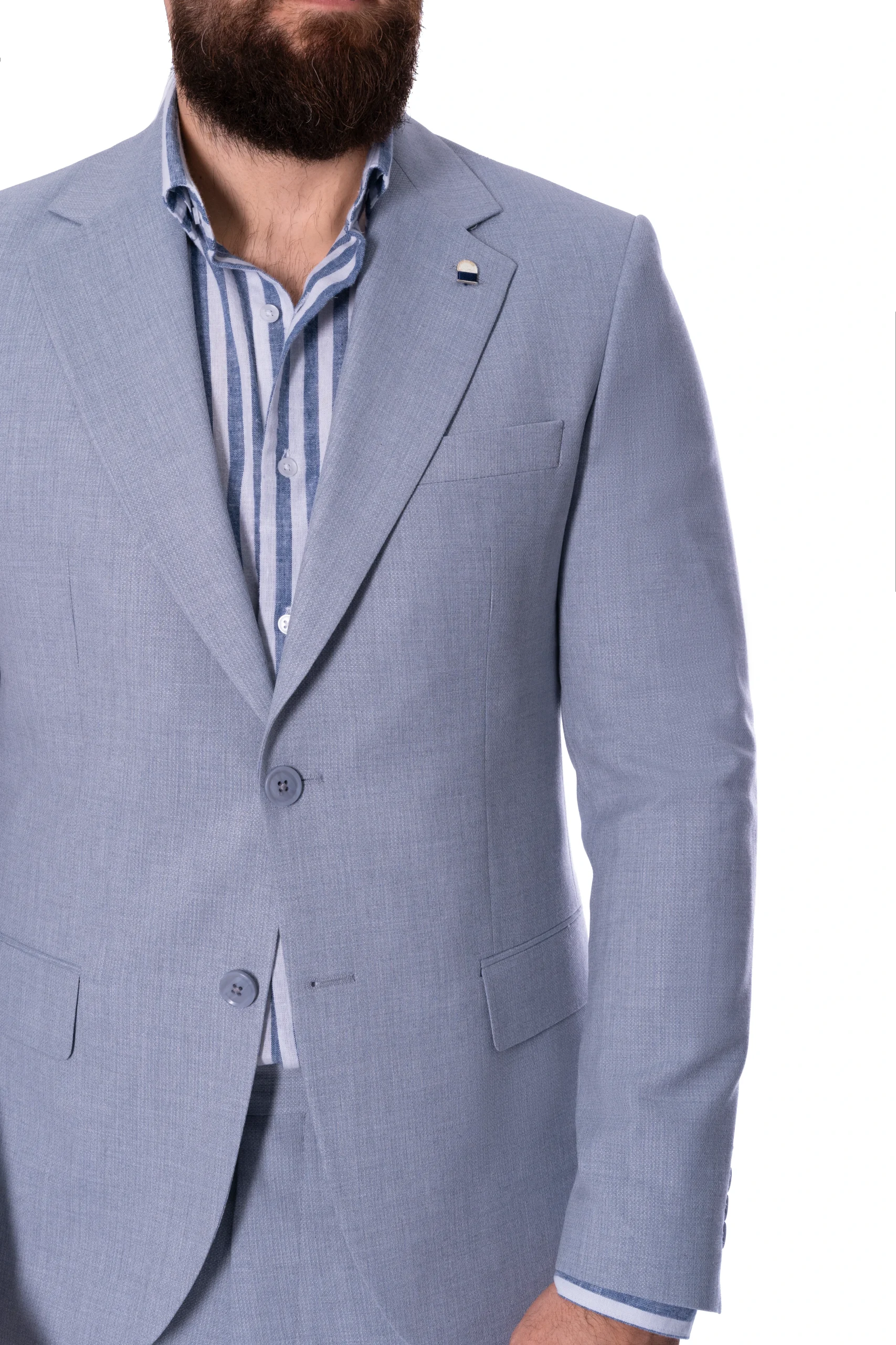 Costumul Bleu Texturat – Este alegerea ideală pentru un look fresh pe timp de zi, are reverul notch/ crestat, proporții bine echilibrate, iar textura prezentă îi conferă un ton de prospețime.
