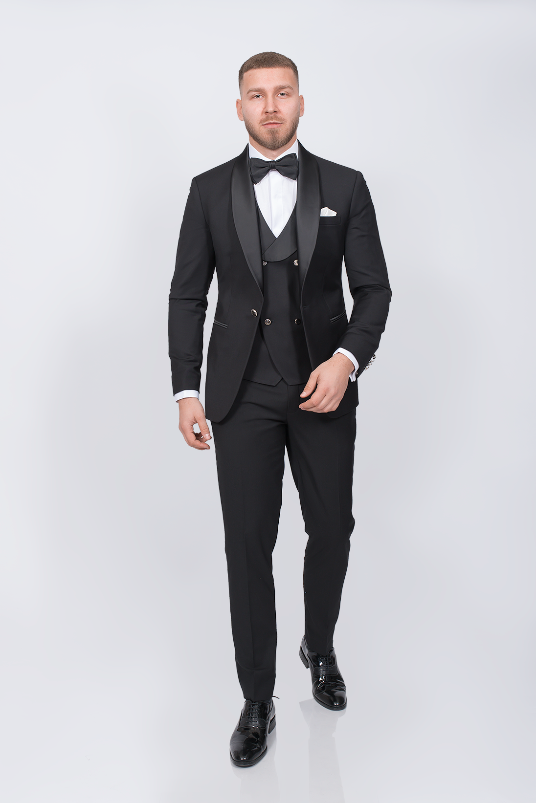 Smoking Black Shawl Lapel este format din 3 piese: sacou, vestă și pantalon. Cu ajutorul sau vei prezenta o imagine impecabila in cadrul oricarui eveniment de tip Black Tie.